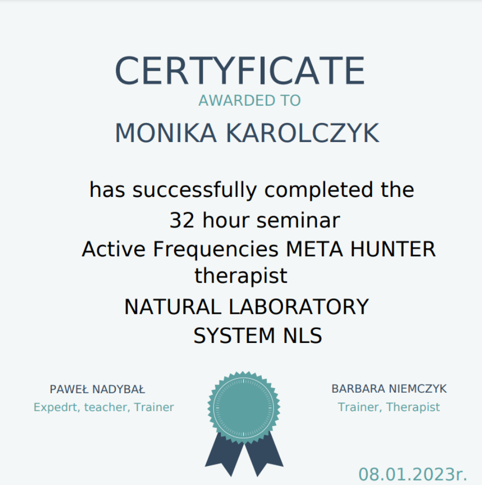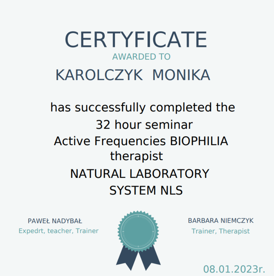 Świat homeopatii oraz biorezonansu zafascynował mnie swoją głębią i możliwościami, a efekty, które obserwowałam, wielokrotnie przerosły moje oczekiwania. Ta pasja ostatecznie wygrała – postanowiłam poświęcić się pracy z osobami potrzebującymi wsparcia homeopatycznego czy diagnozowaniem biorezonansem.